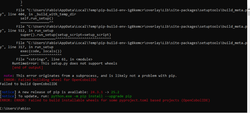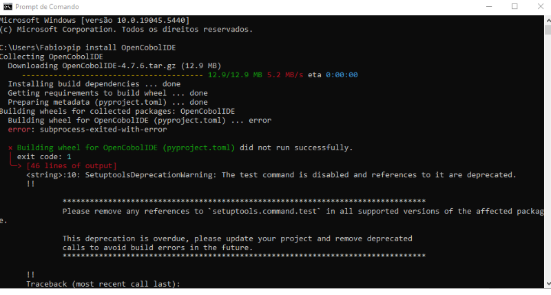 rodei o comando "pip install OpenCobolIDE" no prompt do Dos mas apareceram vários erros,